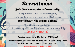Join The Fok’s Singers and become part of a vibrant, harmonious community at our college. This choir offers a wonderful opportunity to experience the profound joy of choral singing, develop your vocal skills, and build lasting friendships with fellow music enthusiasts. Under the expert guidance of our instructor, Mrs Ruth Hui—an experienced choral director and former Music Director & Conductor of the CUHK Woo Sing Choir—you will learn valuable singing techniques and grow as a musician.